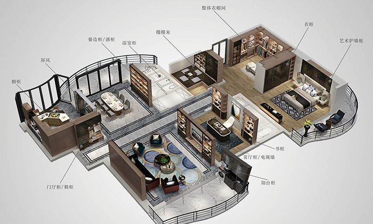 衣柜、衣帽间、门厅柜、餐边柜、橱柜、书柜、客厅电视柜、阳台柜、榻榻米、屏风、酒窖、护墙板、楼梯、单体房等全屋多达20多个空间,均可定制。